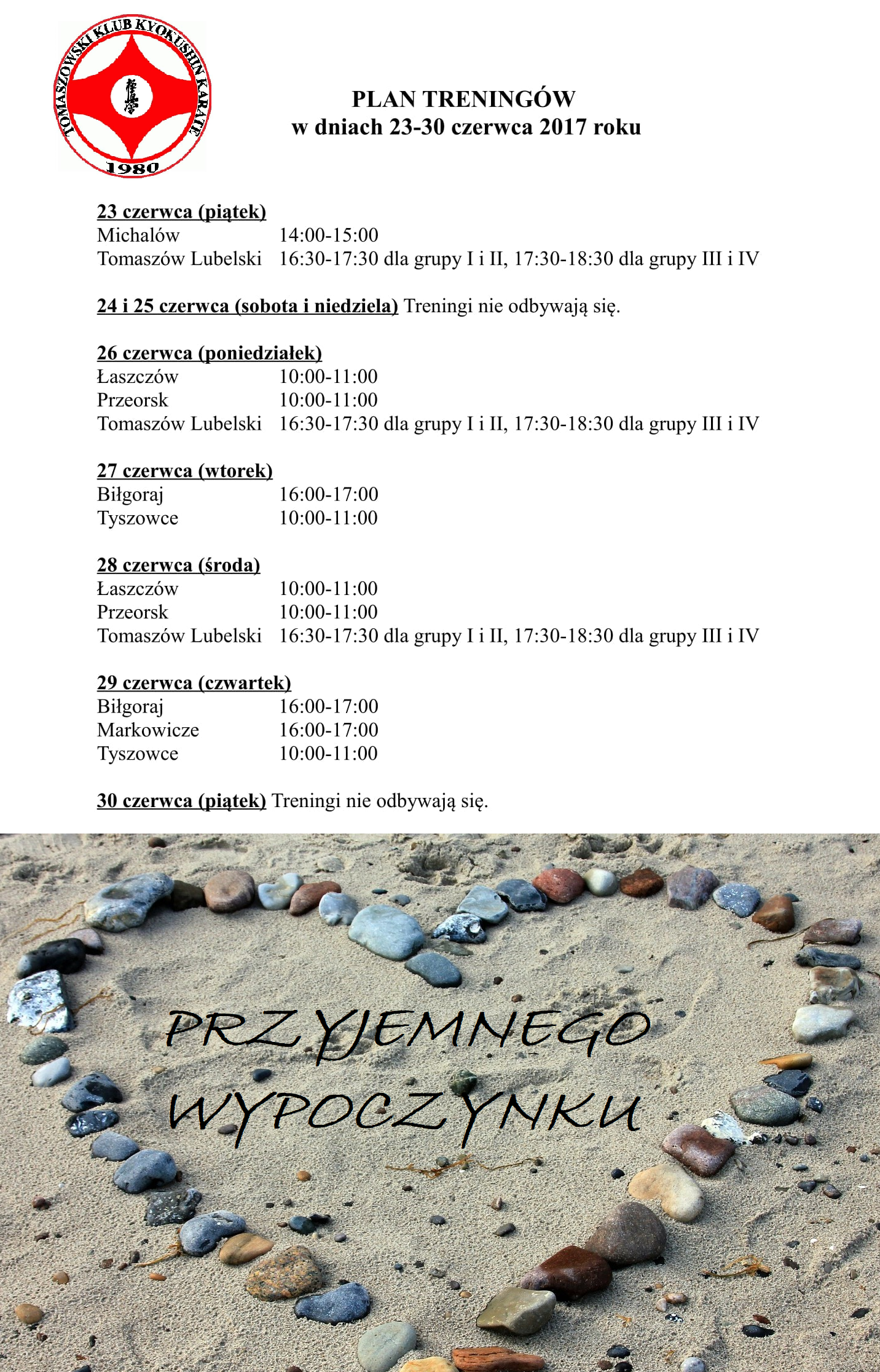 Treningi karate kyokushin będą odbywały się w lipcu w formie seminarium szkoleniowego w poniedziałki i środy w godz. 17:30 - 18:30.